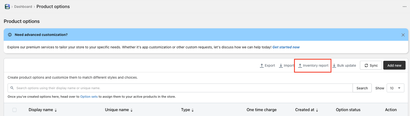 To export the Inventory Report manually please navigate to the Product Options Page > Options Tab > Click on the Inventory Report. Merchant's will receive the exported data on the Store Admin email address.