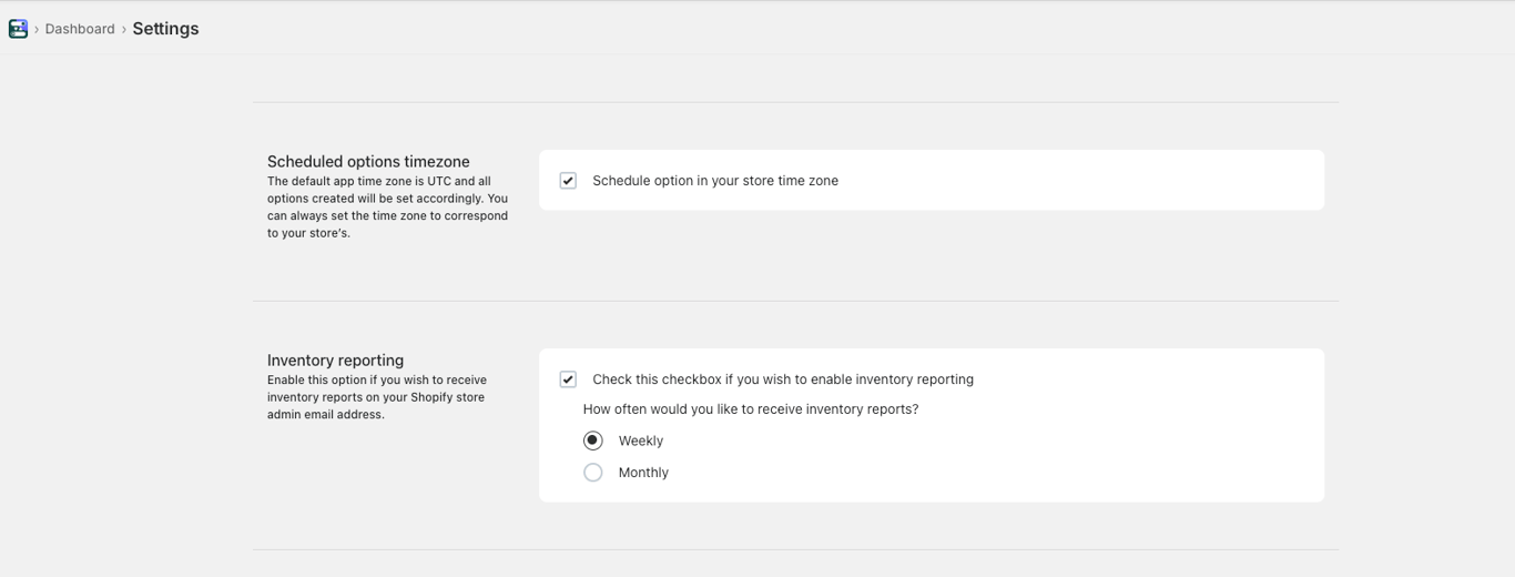 To opt-in for the Automated monthly/weekly Inventory report please navigate to the Settings Page > General Settings > Inventory Reporting > Enable the option and select the time-frame of the automated export.