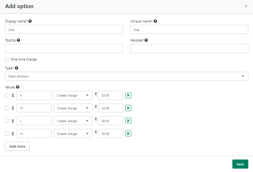 - Assign a price to an option (such as gift-wrapping or engraving) that doesn’t carry inventory, and show your customers how much they need to pay in addition to the base product price. You also have the ability to increase revenue by assigning prices and additional charges to certain selections.