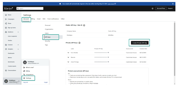 (1) Open your Klaviyo account and navigate to settings > Account > API keys > Create Private API Key