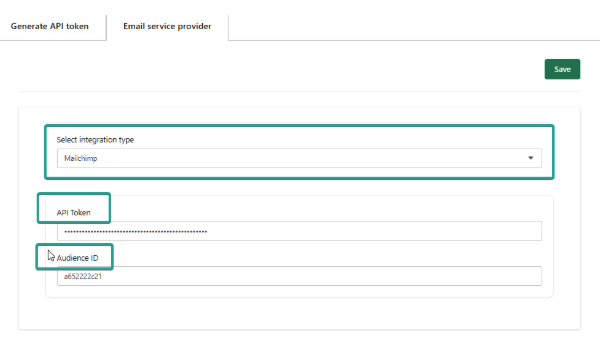 (2) Navigate to settings > Integrations > Email Service Provider and select Integration as Mailchimp and fill up your Mailchimp API Token Data and Audience ID and save it.
