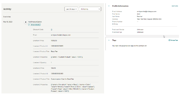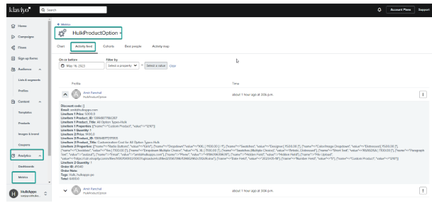 (3) As soon as the customer places an order their contact details will be Fetched in your Klaviyo Analytics Data. Along with their purchase details, you can find them in Klaviyo Analytics > Metrics > HulkProductoption section