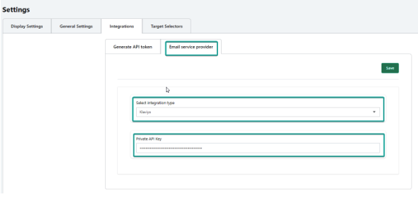 (2) Copy This API Key and fill them in the app’s Email service provider section. Navigate to settings > Integrations > Email Service Provider. Select Integration as Klaviyo and fill up your Klaviyo Private API Key and save it.