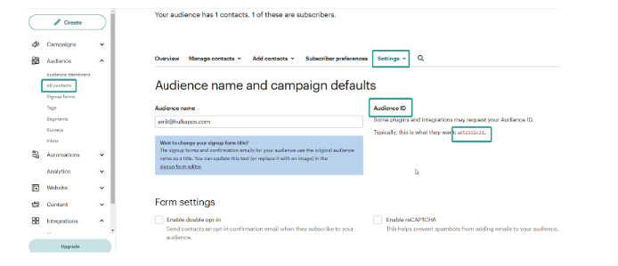 - Get Audience ID it can be found within All contact > settings > Audience name and Defaults > Audience ID
