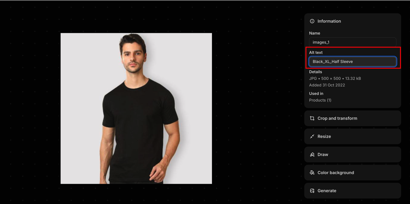 If it’s for a combination of multiple option values, then the alt text should be a string combining the option names, joined by underscores (_), in the prescribed format. For example: OptionName1_OptionName2_OptionName3. Then, when those options are selected together, the image with that alt text is shown.