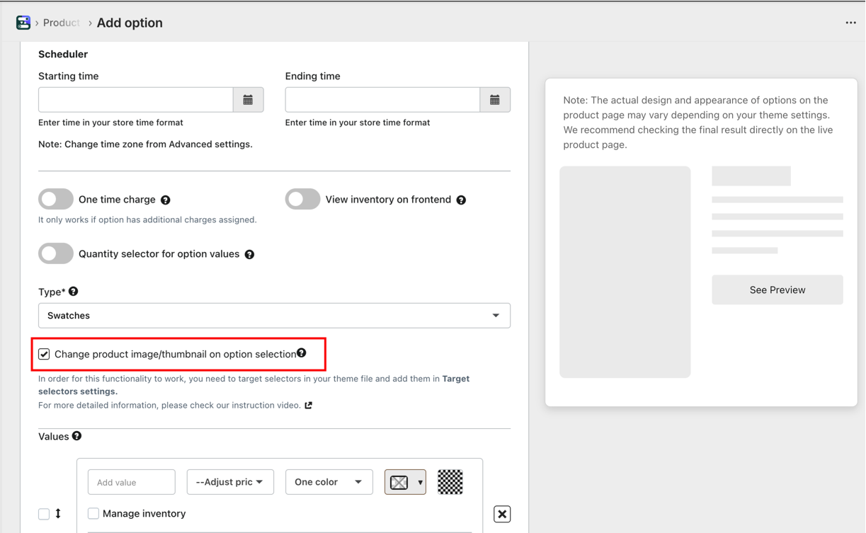 Enable the “Change product image/thumbnail on option selection” checkbox for the options in which you want image change behavior.