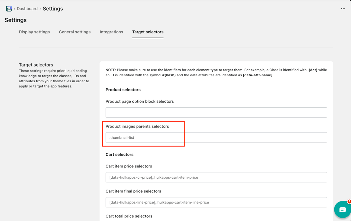 Identify the theme’s product image thumbnail class/selector from your theme’s code (Liquid/CSS). You’ll need to supply that class/selector inside the app (“Product images parent selector”) so the app knows which HTML element to target for image swapping.Image Alt Text Matching: