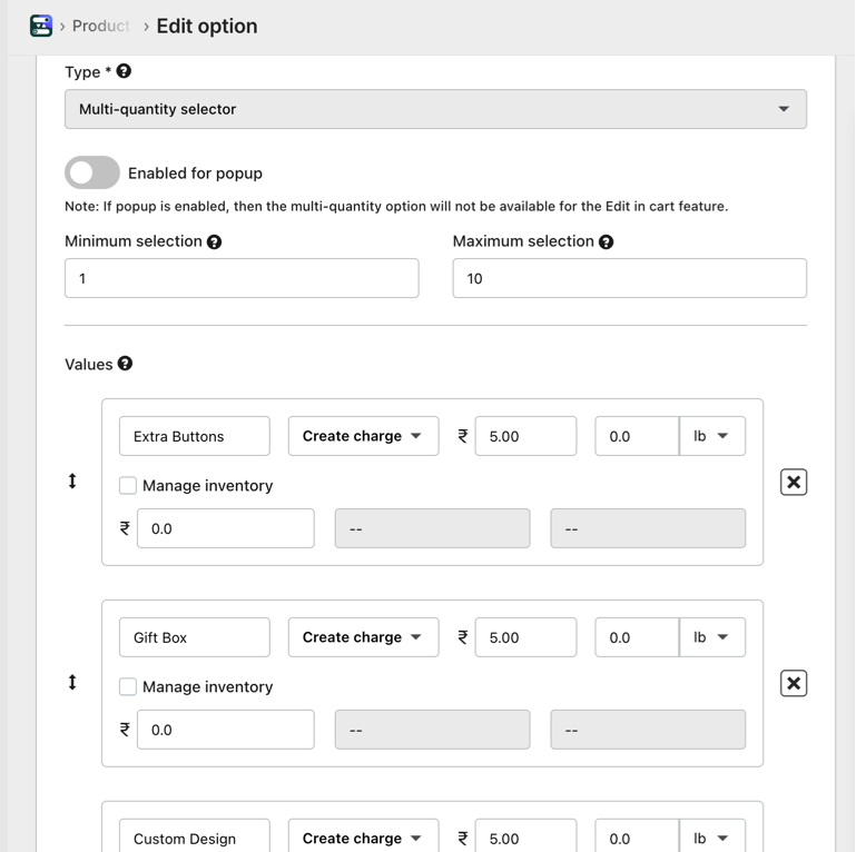 Pricing adjusts based on the quantity chosen for those option values. So if “Extra Button” costs ₹10 each and quantity 2 is selected, that adds ₹20.