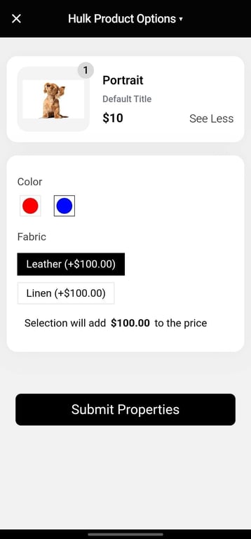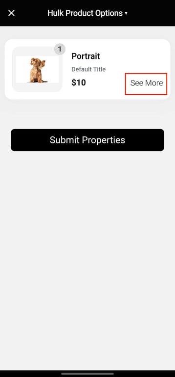 Note: When opening the Hulk Product Options tile, the product added to the cart and its assigned options may take a moment to load.Select or enter the required option properties by clicking on See More.