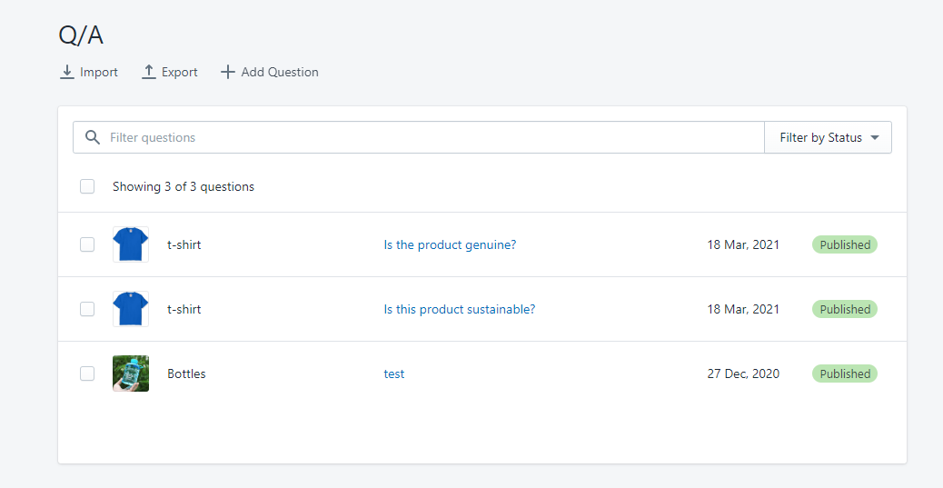 In the Q/A section of the app, a store owner can view the list of all the questions and answers added within the app. Along with this, you can also add questions and answers manually, or bulk import/export them.
