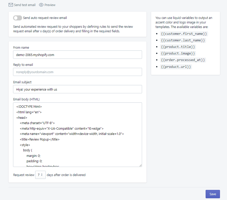 As a store owner, you can customize the request review as per your preference along with the use of provided liquid variables: