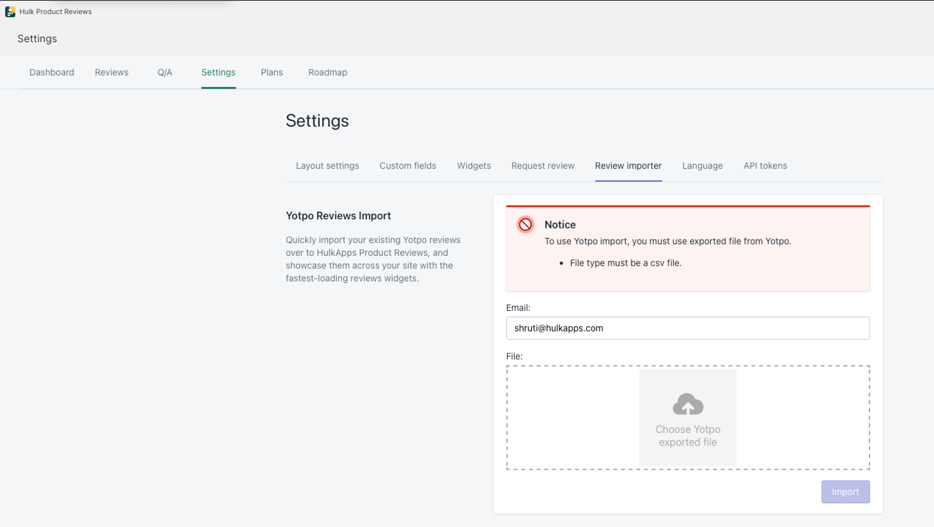 To import the above-mentioned, navigate to the Settings → Review Importer → Upload your Yotpo file.
