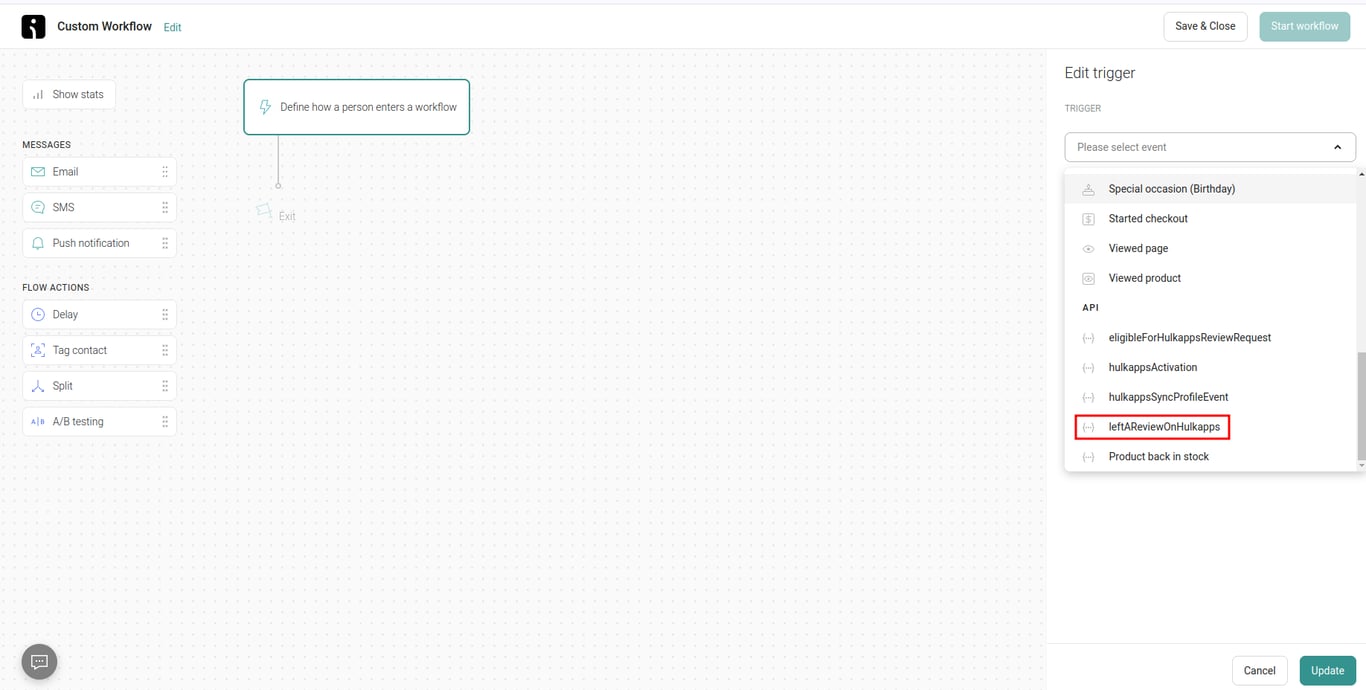 2. From the dropdown menu, choose "Left a review on HulkApps"