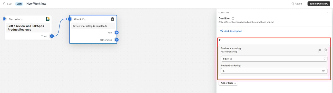 The available condition options depend on the selected trigger. For example, if you choose to trigger when the star rating is 5, you might set a condition related to the review's star rating.