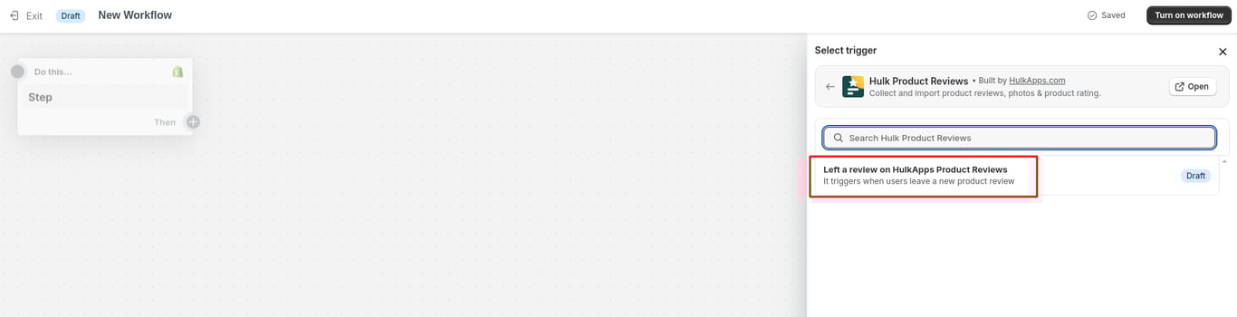 Once you've selected Hulk Product Reviews, another dropdown will appear. This contains Trigger "Left a review" on HulkApps Product Reviews:
