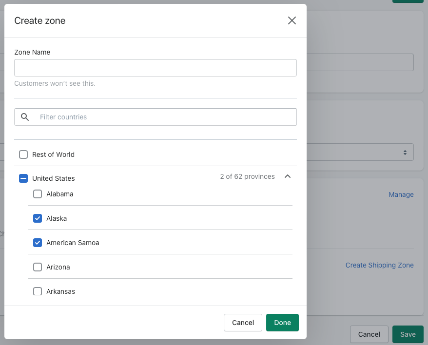 - Enter a name for the shipping zone and choose the countries you would like to ship your subscription products to. Click Done to save your selection.