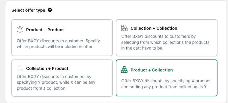 Choose the combination that suits your needs. For example, if you want to create an offer where your customer buys one product and gets any other product from a specific collection for free or discounted, select the "Product + Collection" offer.