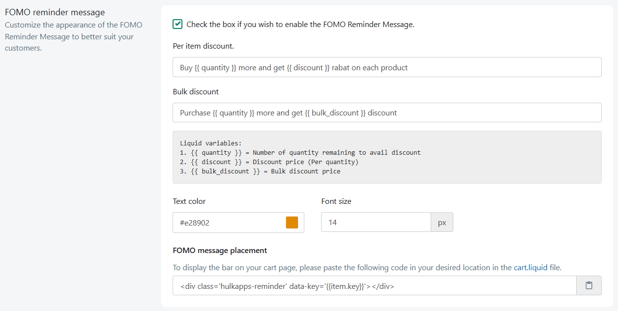Texts on the FOMO Reminder Message can be updated under the App>>Settings>>Cart Settings>>FOMO reminder message