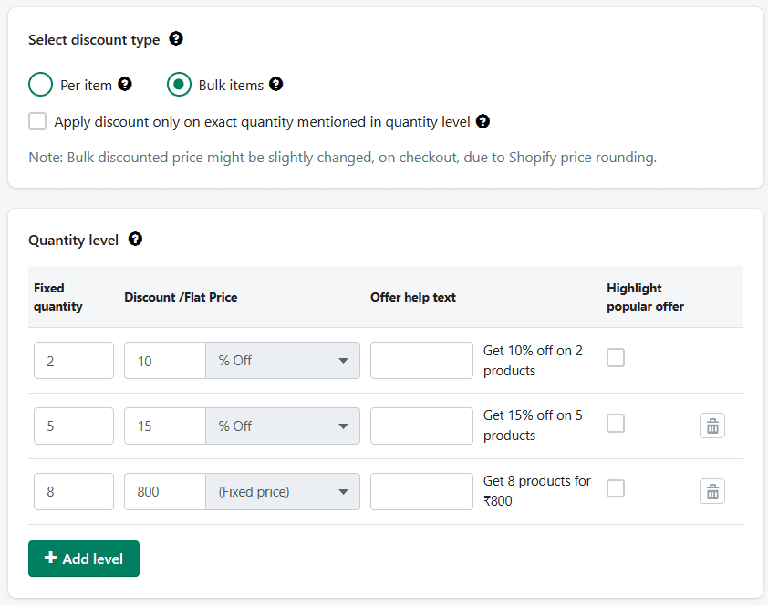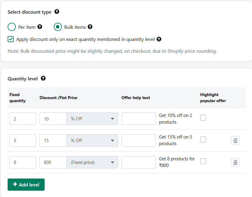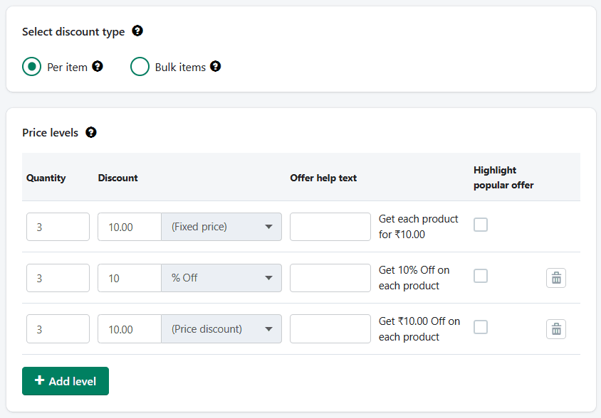 We hope you love this feature that allows the customer to apply an offer Per Item or Bulk Item as well as on the mentioned quantity only in the offer quantity levels.