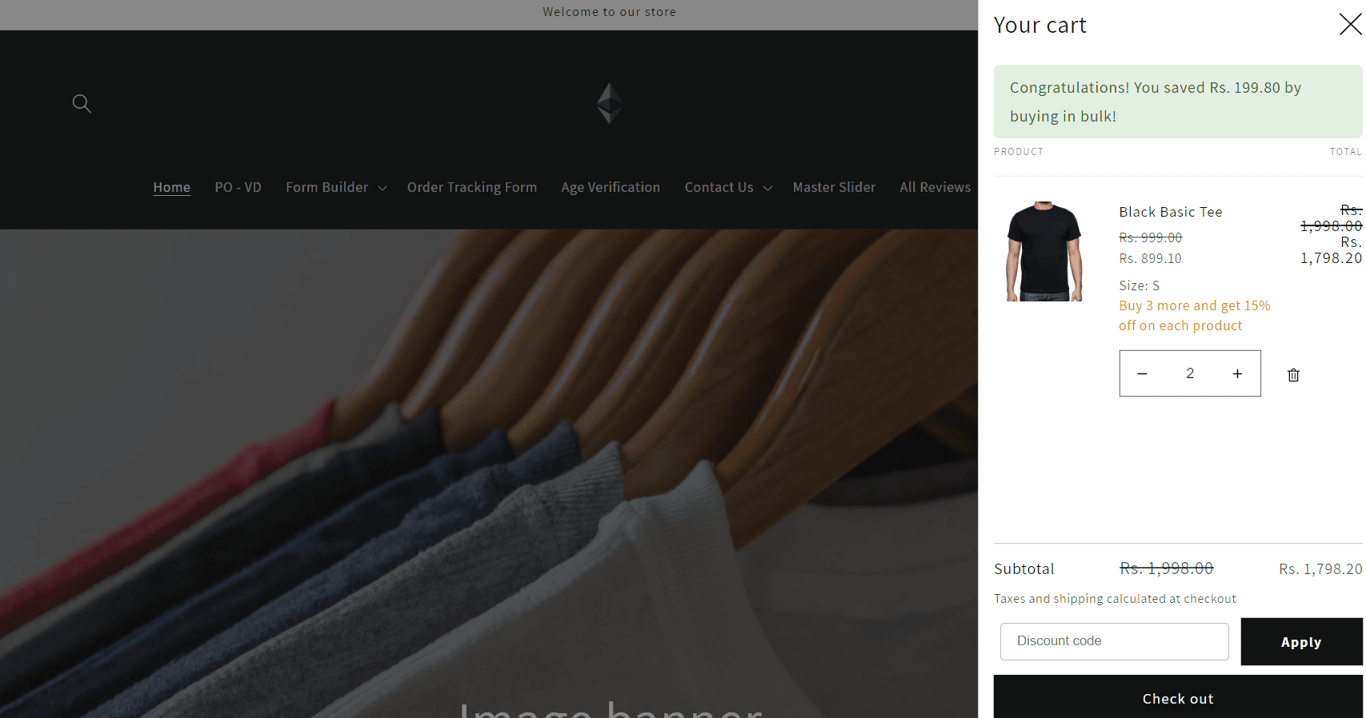 When a user adds 2 quantities to the cart, they will get 10% off on 2 products, 15% off on 5 products, and 20% off on 8 products.